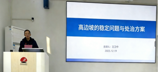 2025年12月19日上午10时,黄河科技学院应用技术学院在3号教学楼西阶205教室举办一场题为《公路路基边坡灾害类型及处治措施》的学术讲座。主讲人为黄河科技学院工学部土建中心智能建造专业负责人王卫中博士,正高级工程师。讲座由土木教研室主任谌伦建教授主持,土木教研室全体教师、土木工程专业学生到场聆听。
