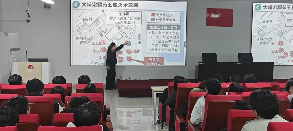 讲座伊始,朱晓丽教授以2025年11月26日香港宏福苑火灾事件为切入点,通过详实的现场图片、数据分析与时间线梳理,复盘火灾发生、蔓延及应急救援的全过程,深入剖析在防火设计、日常运维管理及应急响应机制等方面可能存在的薄弱环节,并在此基础上提出“预防—控制—疏散—救援”四位一体的多维防火防御体系。