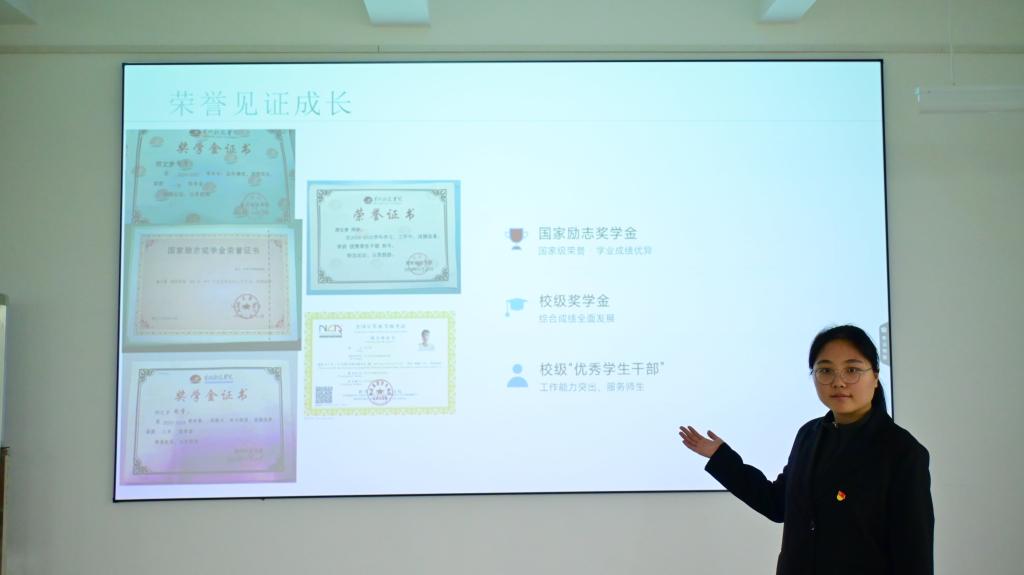 学习模范代表邢文梦分享了专业学习与服务奉献的成长之路,她秉持严谨治学态度,以闭环学习法构建专业知识体系,专业排名稳居前3,斩获多项荣誉;作为班级纪律委员,她主动帮扶学业困难同学、宣传党的理论,还投身基层支教,用行动诠释党员先进性。