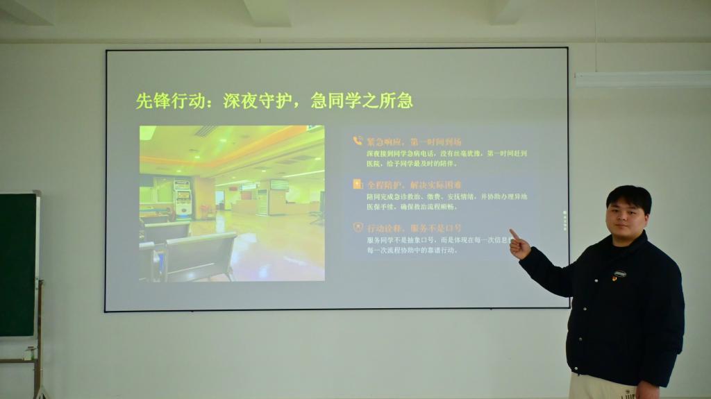 学生干部模范代表杨紫冲分享了“少喊口号,多办实事”的工作理念,他将服务同学落到实处,在陪护同学、协调诉求、规范管理等小事中践行党员初心,赢得师生信任。