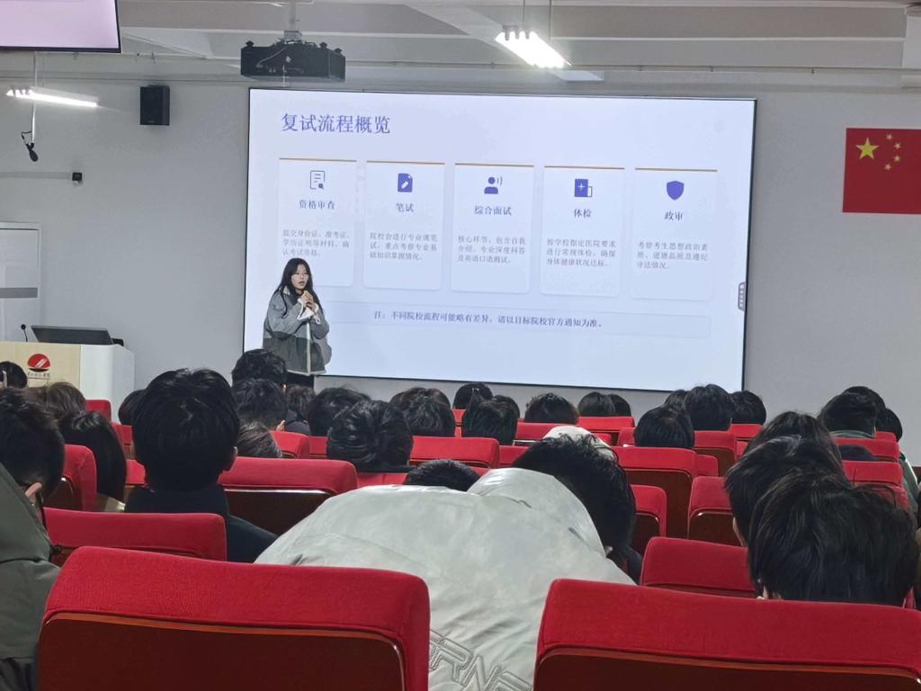 为助力考研学子精准破解复试和调剂难题,明确备考与调剂方向,掌握实战技巧,3月14日下午,应用技术学院考研复试与调剂专题培训交流会在新愚公讲堂(新103教室)顺利举办。本次交流会聚焦考生核心需求,采用线上线下相结合的形式,邀请专业老师线上指导、优秀校友线下分享,通过专项讲解、经验交流与一对一答疑,为学子们搭建高效备考桥梁,助力大家顺利上岸理想院校。