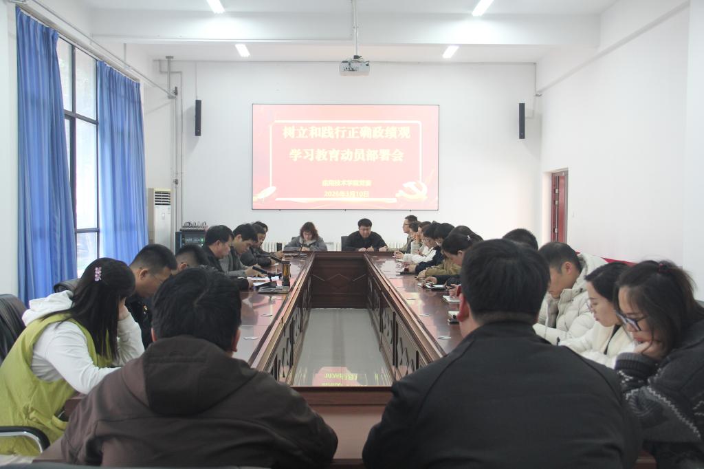 为深入贯彻落实学校党委工作部署,切实引导全院党员干部筑牢思想根基、校准履职方向,3月10日下午,应用技术学院党委召开树立和践行正确政绩观学习教育动员部署会。会议由学院党委副书记高德峰主持,党委书记张丕万出席会议并讲话,全面传达学校相关会议精神,对全院学习教育工作进行周密安排、细致部署,学院全体中层干部、党支部书记和委员参会。